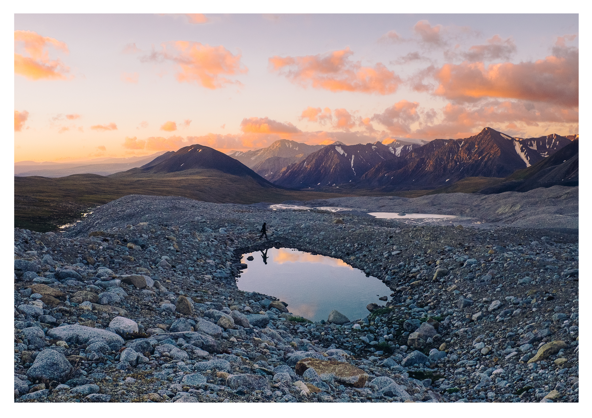 To reach this vista, which is actually the base camp of Altai Tavan Bogd, requires a full day’s hike navigating boulder fields stretching out as far as the eye can see. By late-afternoon I reach base camp, nestled in the shadow of these towering mountains. Climbing up to a high point, I watch as the calm of evening settles over the valley.