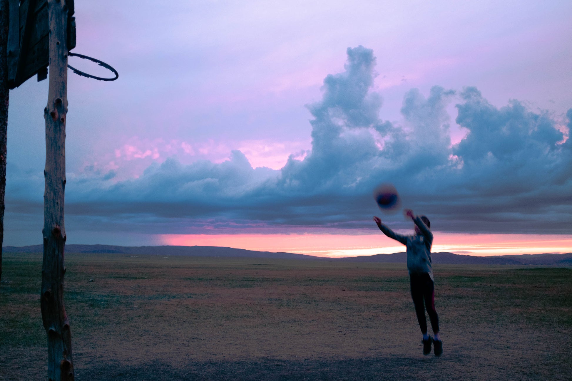 Gorkhi-Terelj National Park, Mongolia: In the fading light of the steppe, a girl shoots a basketball on a homemade court.