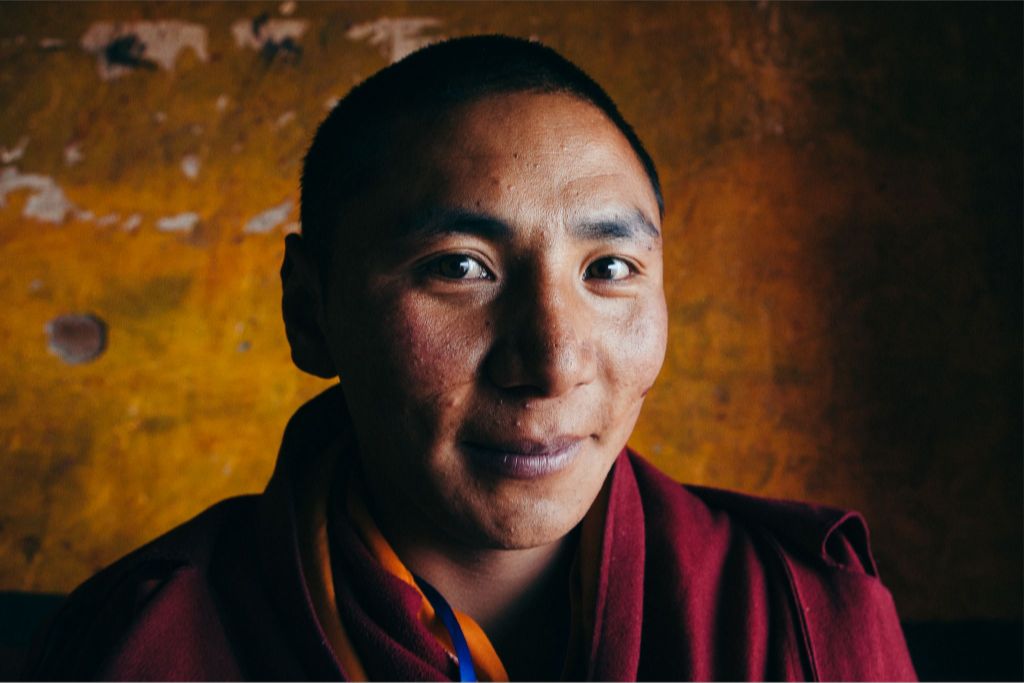 A young lama poses for a portrait in between classes.