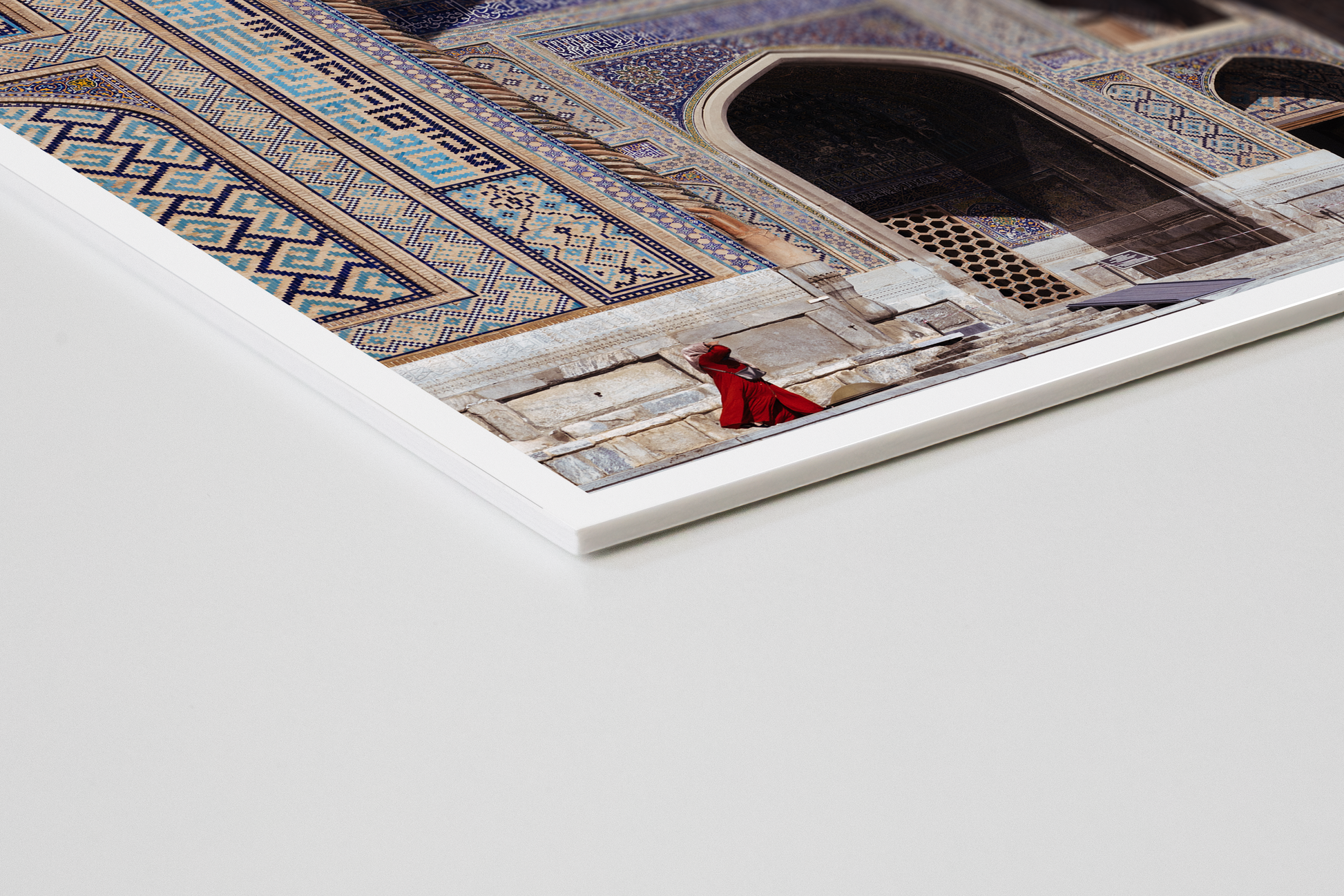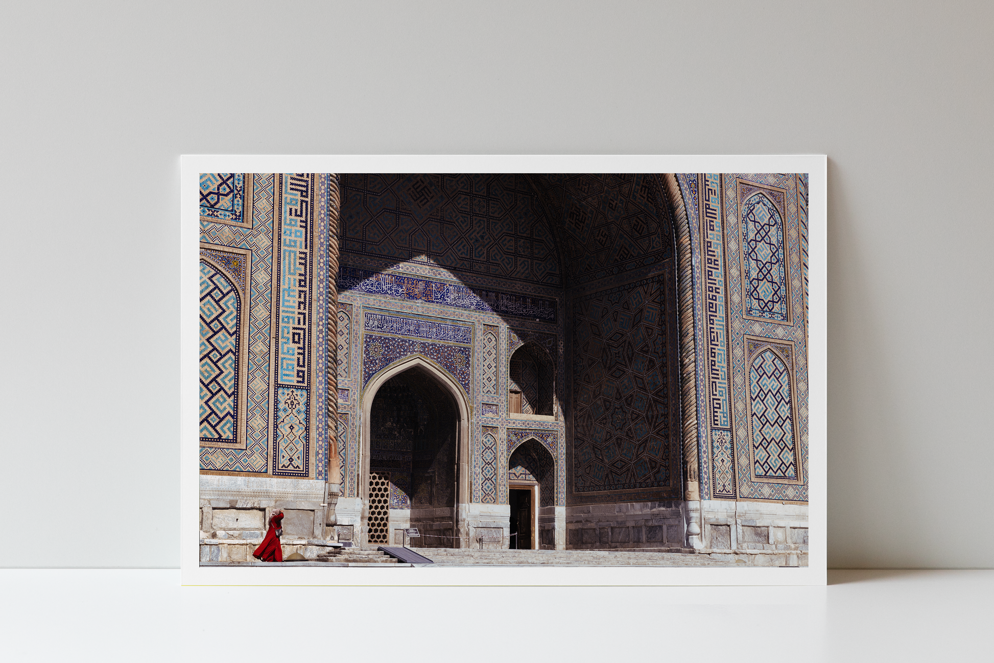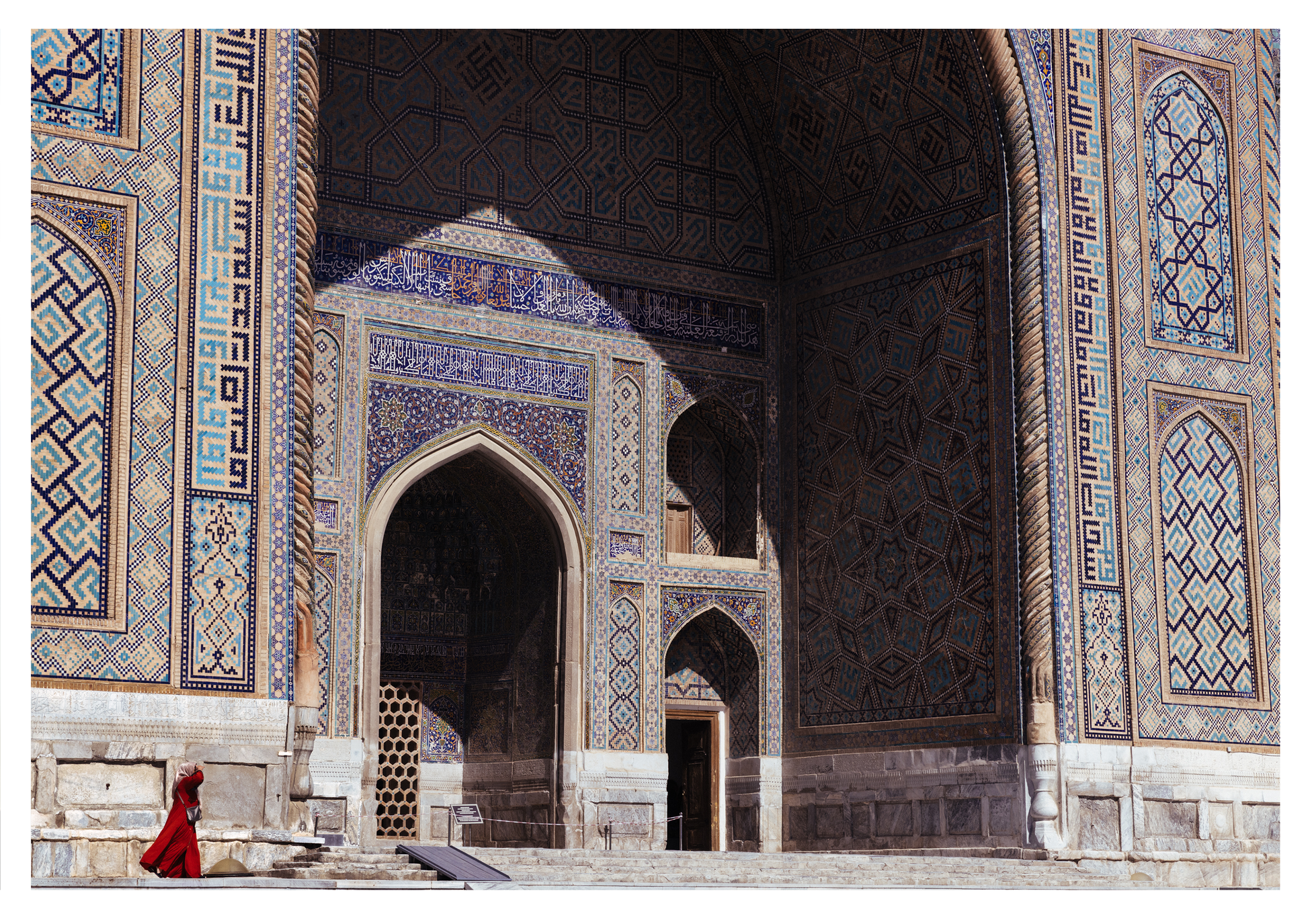 Beneath the iwan of the Sher-Dor Madrasa, a woman walks through, her silhouette dwarfed by the monument’s scale.