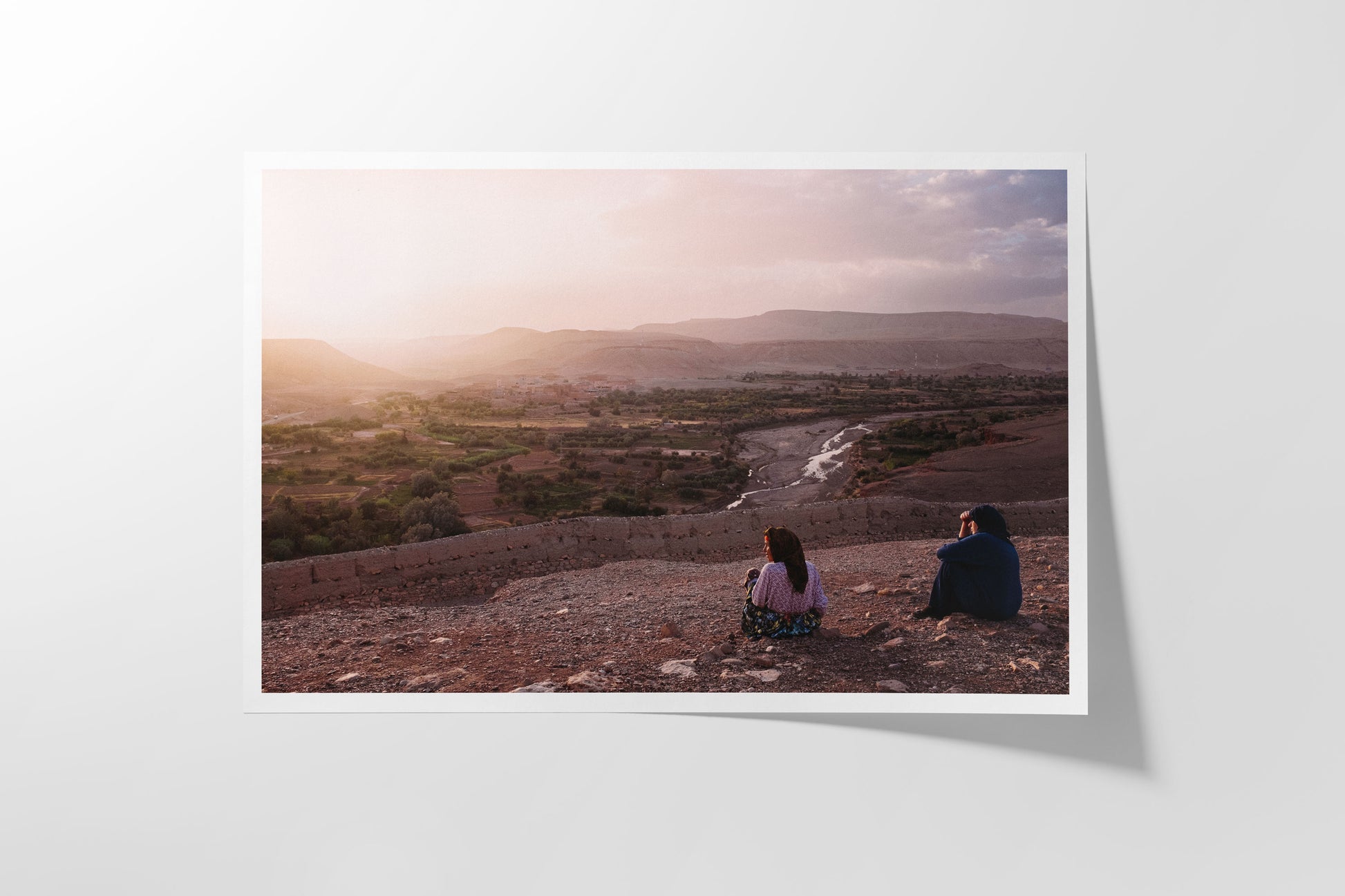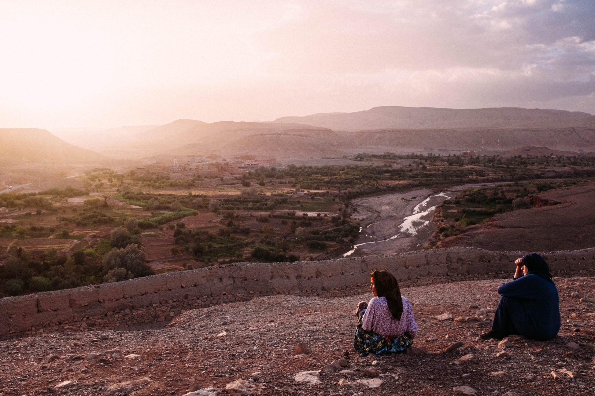 Ouarzazate Province, Morocco: Atop an ancient fortified hill, two women take a pause from their conversation to welcome the setting of the sun over the Middle Atlas Mountains.